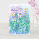 A cheerful thank you card for a midwife decorated with a garden of shasta daisy flowers and pink primrose sketched with blue ink and watercolor. You can edit the message to fit your needs.