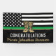 This graduation design features a military flag with black and white stripes, and a thin green line stripe as well. The gold army boots sits above the name of the graduating sergeant, captain, soldier, lieutenant or general.
