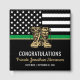 This graduation design features a military flag with black and white stripes, and a thin green line stripe as well. The gold army boots sits above the name of the graduating sergeant, captain, soldier, lieutenant or general.