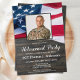 American Flag Military Retirement Invitations - Celebrate years of dedicated service, and invite friends and family to your militaryretirement party with this American Flag Retirement Invitation - USA American flag design on rustic wood. This military retirement invitation is also perfect for military graduation invitations, police retirement invitation, change venue in personalisation. See our collection for matching military retirement gifts, graduation gifts,party favours, and supplies. COPYRIGHT © 2021 Judy Burrows, Black Dog Art - All Rights Reserved. Military Retirement Custom Photo American Flag Invitation