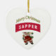 Merry Christmas Sapper Ornament. This heart shaped ornament is decorated on one side with the Military Sapper tab, Santa Claus, and the words "Merry Christmas." The reverse side is decorated with dog-tags and the words "I Love My Soldier."