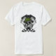 This skull wears a helmet with wings perhaphs airborne wings beneath him are two military tanks and two bullet belts to the left and right of the skull. The skull also wears dogtags behind him is a shield.