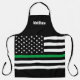 For those in the military, border patrol, park rangers and conservation officers this thin green line apron features a black, white and green American flag with stars and stripes with a border of black above and below. Personalise with a name in white typography. Designed by Susan Coffey.