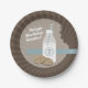 Birthday party plates featuring an illustration of bottle of milk and striped cookies.