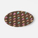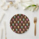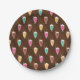 A fun milkshake pattern in chocolate brown on a paper plate for parties and comes with a background of brown stripes in a variety of milkshakes with whipped cream and a cherry on top.