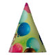 Birthday party hats featuring a pair of cute birthday kitties floating on colourful balloons scattered with glittery gold stars. Use the menu on the right to edit and choose from a range of different options.