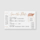 Miniature boarding pass cruise ship ticket save the date magnet to include with your destination wedding save the date suite features a rust copper cruise ship with waves illustration and elegant retro modern fonts with space to add a custom cabin number by the barcode. These mini ticket magnets are the same size as a business card and do not come with envelopes unless you opt to add them. They are a perfect design to compliment any other save the date cards you are sending for your travel theme cruise destination wedding and guests will love them!