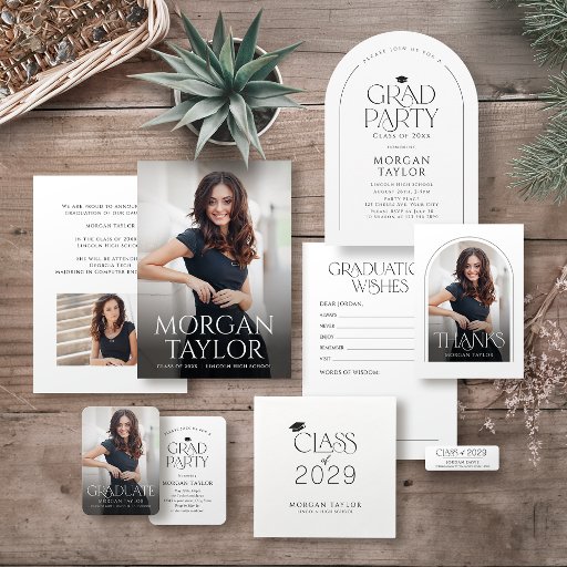 Black and white simple mini size graduation announcement and Invite features elegant graceful serif font with photo , simple and sophisticated, Custom it with your own photo and grad party information in the back.