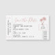A mini boarding pass save the date magnet for a tropical beach wedding with a rose gold blush pink palm tree and authentic retro printed ticket computer fonts, seat number, bar code, and arrows. This is a small magnet, about the size of a business card, that you can send along with your beach destination wedding save the date cards, or hand out to your bridesmaids, groosmen, and family members as a special reminder for the fridge with the vacation party dates in mind.