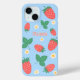 A sweet phone case that features a delightful and playful pattern of scattered mini strawberries on blue background. The strawberries are rendered in a vibrant red with green leaves, and they are interspersed with small, delicate white or light yellow strawberry flowers, adding to the charm. The overall impression is cheerful, fresh, and sweet, making it ideal for children or teenagers.