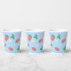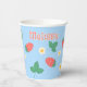 A sweet cute paper cup that features a delightful and playful pattern of scattered mini strawberries on a soft, sky blue background. The strawberries are rendered in a vibrant red with green leaves, and they are interspersed with small, delicate white or light yellow strawberry flowers, adding to the charm. The overall impression is cheerful, fresh, and sweet, making it ideal for children.