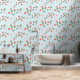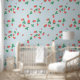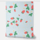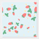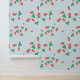 A sweet cute wallpaper that features a delightful and playful pattern of scattered mini strawberries on a sweet, light blue sky background. The strawberries are rendered in a vibrant red with green leaves, and they are interspersed with small, delicate white or light yellow strawberry flowers, adding to the charm. The overall impression is cheerful, fresh, and sweet, making it ideal for nursery’s decor and baby, toddler, child rooms.