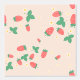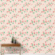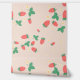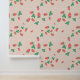 A sweet cute wallpaper that features a delightful and playful pattern of scattered mini strawberries on a sweet, light peach background. The strawberries are rendered in a vibrant red with green leaves, and they are interspersed with small, delicate white or light yellow strawberry flowers, adding to the charm. The overall impression is cheerful, fresh, and sweet, making it ideal for nursery’s decor and baby, toddler, child rooms.