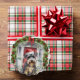 A Christmas Holiday Ornament Card with Miniature Schnauzer Dog in a Santa hat and holiday lights, stood in front of a Christmas decorated front door. Schnauzer dog Holiday decoration cards, a unique wonderful alternative to a traditional card from Ricaso - add your own text