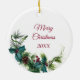 On the front of this Holiday ornament is an artist's portrait of a beautiful grey Miniature Schnauzer Dog. The dog is framed with a holly, red berry, and pine needle half wreath. The back of the ornament has the same evergreen bough wreath with your custom text in red.