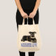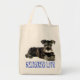 This fun canvas tote bag features an image of a cream and grey Miniature Schnauzer puppy dog with Schnauzer printed in a bold blue and white stripe font.