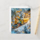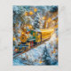 Miniature steam train on snowy mountain track holiday postcard