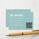 Keep your wedding guests informed with this stylish and functional details card. Featuring a clean and modern aqua blue background with elegant white typography, this card includes a QR code for easy access to your wedding website, RSVP details, and event information. A perfect addition to your wedding invitation suite, ensuring guests have all the essential details at their fingertips. Ideal for modern and minimalist wedding themes!