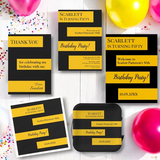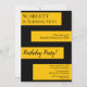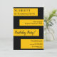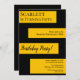 This elegant black and gold Birthday invitation is perfect for a modern Birthday. the simple design features elegant black calligraphy on gold stripes on a black background.