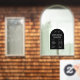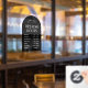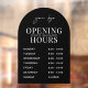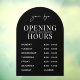 Minimalist business opening times window cling decal template with black arch design and simple white text layout. This fully editable opening hours sign includes space for your company logo, operating times and phone number. A great way to display your opening days and times on your shop window - can be used for your cafe, restaurant, salon or any other business.