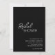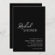 Modern black bridal shower invitation featuring a simple and minimal design with the event title in an elegant script and a contemporary sans serif font. Below in the lower right corner are your event details in a minimalist layout.