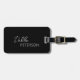 Modern black luggage tag featuring a simple and minimal design with your name in an elegant script and contemporary sans serif font. The back has your contact information in a minimalist layout.