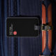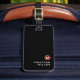 Modern luggage tag design features a red monogram medallion on a black background, with your monogram initial and name in white a simple stylish professional look.
