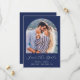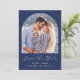 This simple, minimalist Save the Date card features a boho photo arch above the words "Save the Date" in elegant white handwriting script, followed by the couple's names, wedding date and city in sans serif font on a navy blue background. Add a more detailed message with additional information on the reverse.