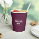 Minimal business logo simple typography soft white and maroon purple red branded coffee paper cups. Customise with your company's logo and add your own personalised text. Text font and colour can easily be changed in the design editor to match your branding colours.
