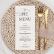 Make a timeless statement with our Minimal Calligraphy Black & White Dinner Wedding Menu. Featuring elegant black calligraphy on a crisp white background, this design embodies pure sophistication and modern minimalism. Perfect for classic, contemporary, or black-tie weddings, it beautifully highlights your meal selections while adding a refined touch to your reception décor. Printed on premium-quality cardstock and fully customisable, it’s the perfect detail for an effortlessly chic celebration.