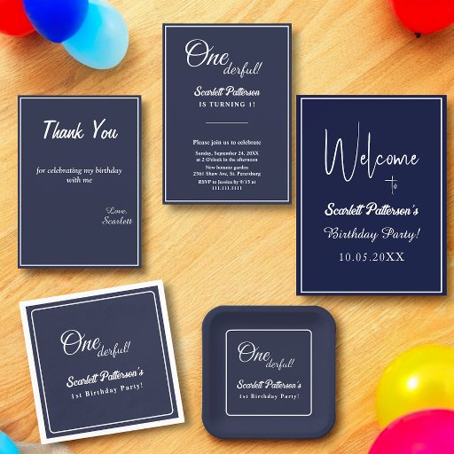 Minimal Chic Navy Blue White Delicate 1st Birthday Thank You Card