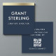 Elevate your brand presence with this navy blue and gold elegant business card, featuring a minimal typographic layout and scannable QR code for effortless networking. The clean square format exudes sophistication and professionalism, while the gold accents add a refined, high-end touch. Perfect for consultants, designers, executives, or anyone seeking a timeless and luxurious identity piece.