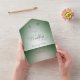 AVAILABLE WITH OR WITHOUT A QR CODE OR DINNER SELECTION OPTIONS. This design features an emerald green background with a soft white blur oval centre. A monogram with the bride and groom's first initial completes it. Created by Simply Farmhouse Press.