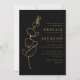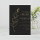 This simple, elegant wedding invitation features a graceful line drawing of a eucalyptus sprig in gold faux foil. Customise the gold-coloured text with the first names of the bride and groom in serif font and the remaining text in sans serif and handwriting script on a black background. The back of the card is solid black.