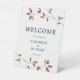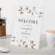 This simple minimalist fall wedding welcome pedestal sign has sprigs of delicate autumn leaves at the top and bottom, with an ivory background. Find matching products in the collection, or contact me through Zazzle chat for additional products or other colorways.
