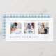 Clean minimalist botanical holiday design featuring Happy Holidays script greeting with line-drawn dusty blue leaves, three-photo template and editable text field with complementary blue tartan pattern on back.