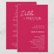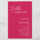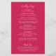 Modern Viva Magenta pink wedding program featuring a simple and minimal design with the bride's name in an elegant script and the groom's name in a contemporary sans serif font. Below in the lower right corner are your event details and order of ceremony in a minimalist layout. The back has your wedding party and thank you message.