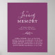 This minimal leaf berry in loving memory memorial poster sign is perfect for an elegant wedding. The design features a simple greenery leaf silhouette in a romantic summer violet colour with minimalist bohemian garden style.