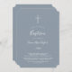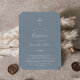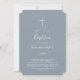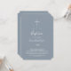 This minimal leaf blue and white baptism invitation is perfect for an elegant baby baptism. The design features a simple greenery silhouette in white on a dusty blue background with classic minimalist style.