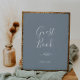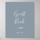 This minimal leaf blue and white guest book poster sign is perfect for an elegant wedding. The design features a simple greenery silhouette in white on a dusty blue background with classic minimalist style.