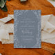 This minimal leaf blue and white wedding invitation card is perfect for an elegant wedding. The design features a simple greenery silhouette in white on a dusty blue background with classic minimalist style.