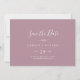 This minimal leaf mauve horizontal save the date card is perfect for a boho wedding. The design features a simple greenery leaf silhouette in a romantic purple pink colour with minimalist bohemian garden style.