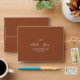 These minimal leaf terracotta self-addressed RSVP envelopes are perfect for a boho wedding. The design features a simple greenery leaf silhouette in earthy burnt orange with minimalist desert bohemian style. Personalise with the name of the bride and groom and RSVP address.