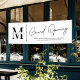 Minimalist black and white Business Grand Opening Outdoor Banner, featuring space for your monogram or logo, business name, address and contact details. The large trendy script font reads 'Grand Opening'. A great way to stand out and promote the launch of your new business with this modern company logo banner - use it for your new boutique, beauty salon, spa or shop.