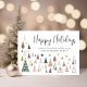 Fun minimal modern Christmas card featuring retro abstract illustrations of green, terracotta and gold trees and stars, "Happy Holidays" in a stylish script and your greeting and name in simple typography. On the back, add two photos and a personalised message.