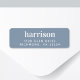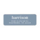 Dusty blue return address label with your family name in bold minimal modern white typography.