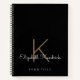 Modern personalised black notebook with your initial and name in minimal gold typography and white script. Add a title if desired.