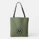 Modern monogrammed tote bag features a minimalist design with olive green and black monogram emblem on an olive background.