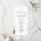Simple, minimalist, black and white, modern script wedding program, with photo of the couple at the back.