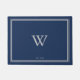 A doormat featuring a minimal style monogram framed in the centre. Underneath this towards the bottom is the established date of your family. The background contains a deep navy. The outside border frame is silver to compliment the background along with the silver monogram.